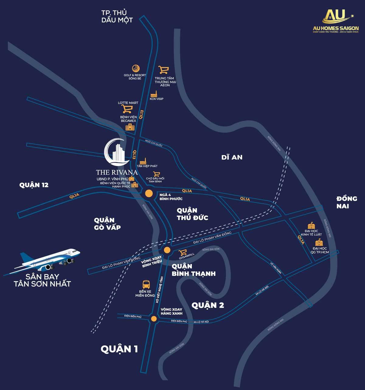 Vị trí chung cư Rivana Vĩnh Phú nằm ngay trên mặt tiền QL 13, Phường Vĩnh Phú, Thành Phố Thuận An, Tỉnh Bình Dương. Vị trí The Rivana Thuận An Bình Dương chính là “vị trí vàng“ngay sát trung tâm hành chính Thuận An, đi tầm 15 xe máy là đến địa phận TP.HCM & các tuyến đường quan trọng như: Quốc lộ 13, Đại lộ Bình Dương, Thủ Khoa Huân, Nguyễn Thị Minh Khai, Lê Hồng Phong, Phạm Văn Đồng.