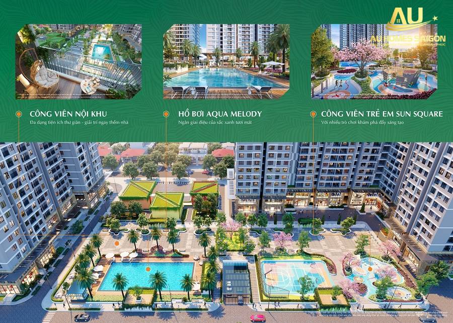 • Công viên cây xanh: Không gian rộng lớn với nhiều cây xanh, đường dạo bộ, là nơi lý tưởng để cư dân thư giãn và hít thở không khí trong lành.