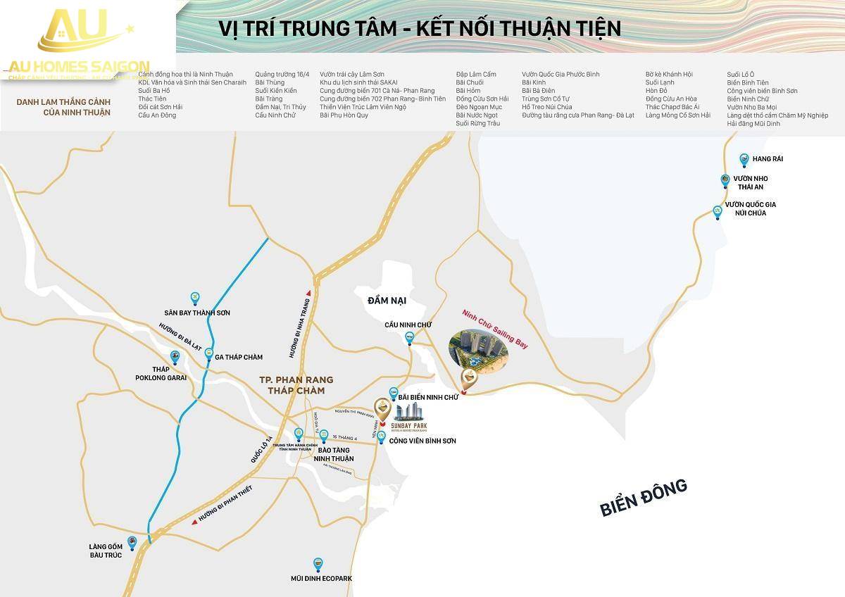 Ninh Chữ Sailing Bay tọa lạc ngay tại Tri Hải và chỉ cách trung tâm TP. Phan Rang – Tháp Chàm khoảng 9km, bởi vậy dự án được thừa hưởng đầy đủ tiện ích ngoại khu từ khu vực xung quanh: