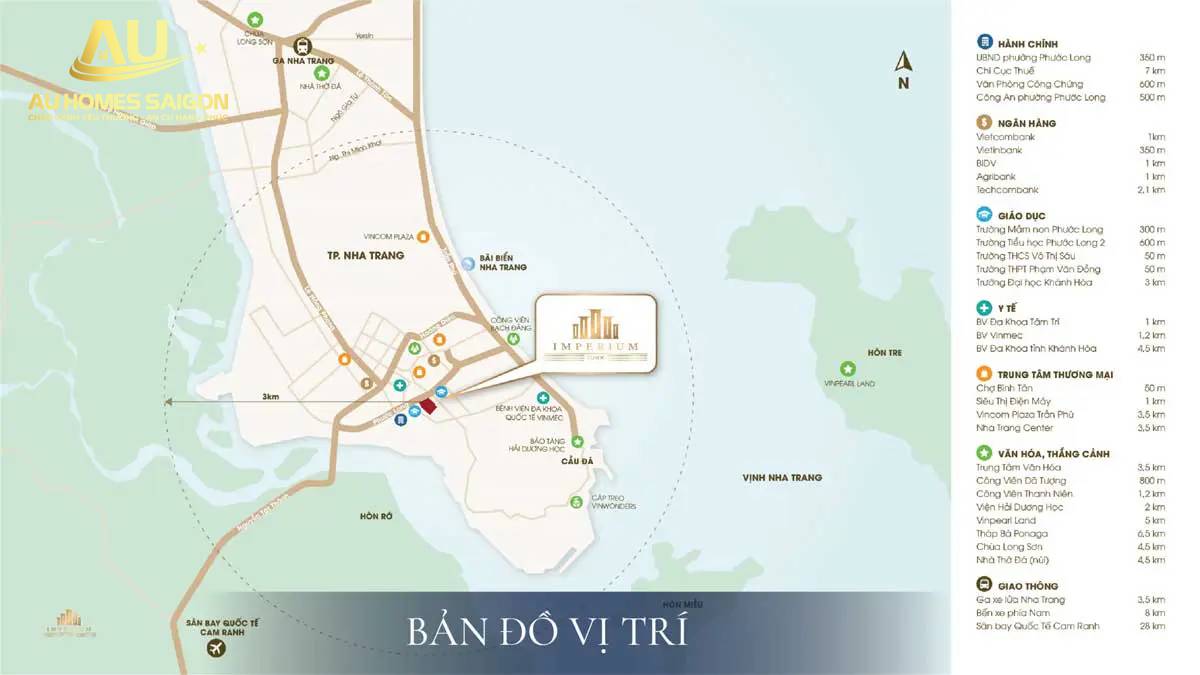 Từ dự án, cư dân Imperium Town Nha Trang có thể dể dàng tiếp cận với các địa điểm du lịch nổi tiếng của TP. Nha Trang như: Vinpearl Land Nha Trang, Diamon Bay – Wonder park, Hồ cá Trí Nguyên, Tắm Bùn Tháp Bà, Viện Hải Dương học, Tháp Bà Ponagar, Bãi Sạn, Bãi Tranh, Hòn Tằm, Hòn Chồng, Hòn Lao (Đảo Khỉ), Hòn Mun, Con Sẻ Tre, KDL Suối Hoa Lan (đảo Hòn Hèo), Yang Bay, Dốc Lết, Waterland Thạch Lâm.