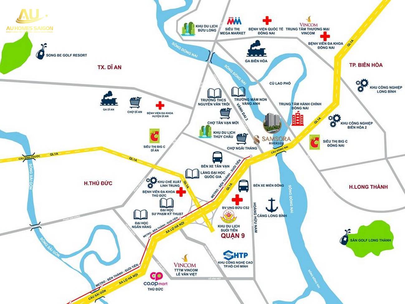 Ngoài các tiện ích nội khu đẳng cấp, cư dân Samsora Riverside còn tiếp cận được hàng loạt các tiện ích ngoại khu chỉ trong vòng 15 phút di chuyển: