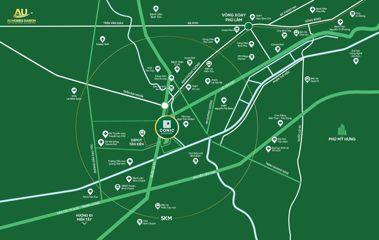 Chung cư Conic Bình Chánh nằm ngay mặt tiền đường Huỳnh Bá Chánh, thuộc xã Tân Kiên – cửa ngõ Tây Sài Gòn, Chung cư Conic Bình Chánh không chỉ thuận tiện di chuyển đến trung tâm thành phố mà còn hưởng lợi lớn từ các công trình hạ tầng xung quanh.