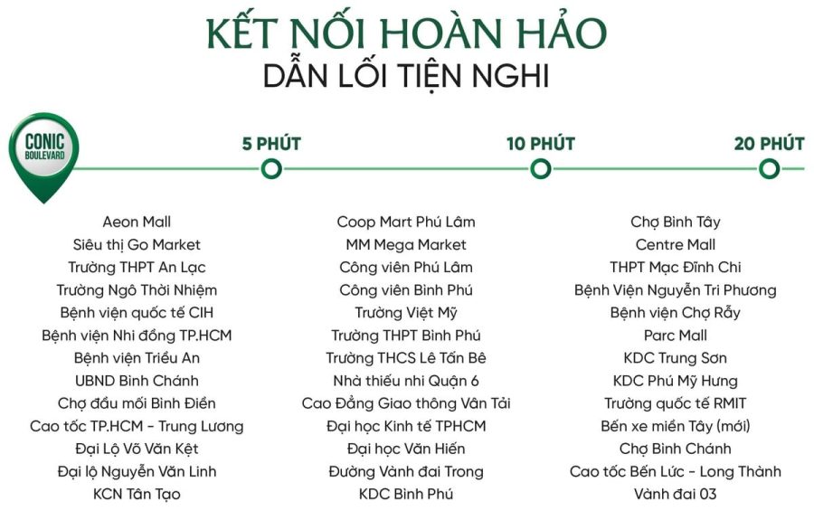 - 20 phút vào Quận 5 – Quận 6 hoặc xuống Long An